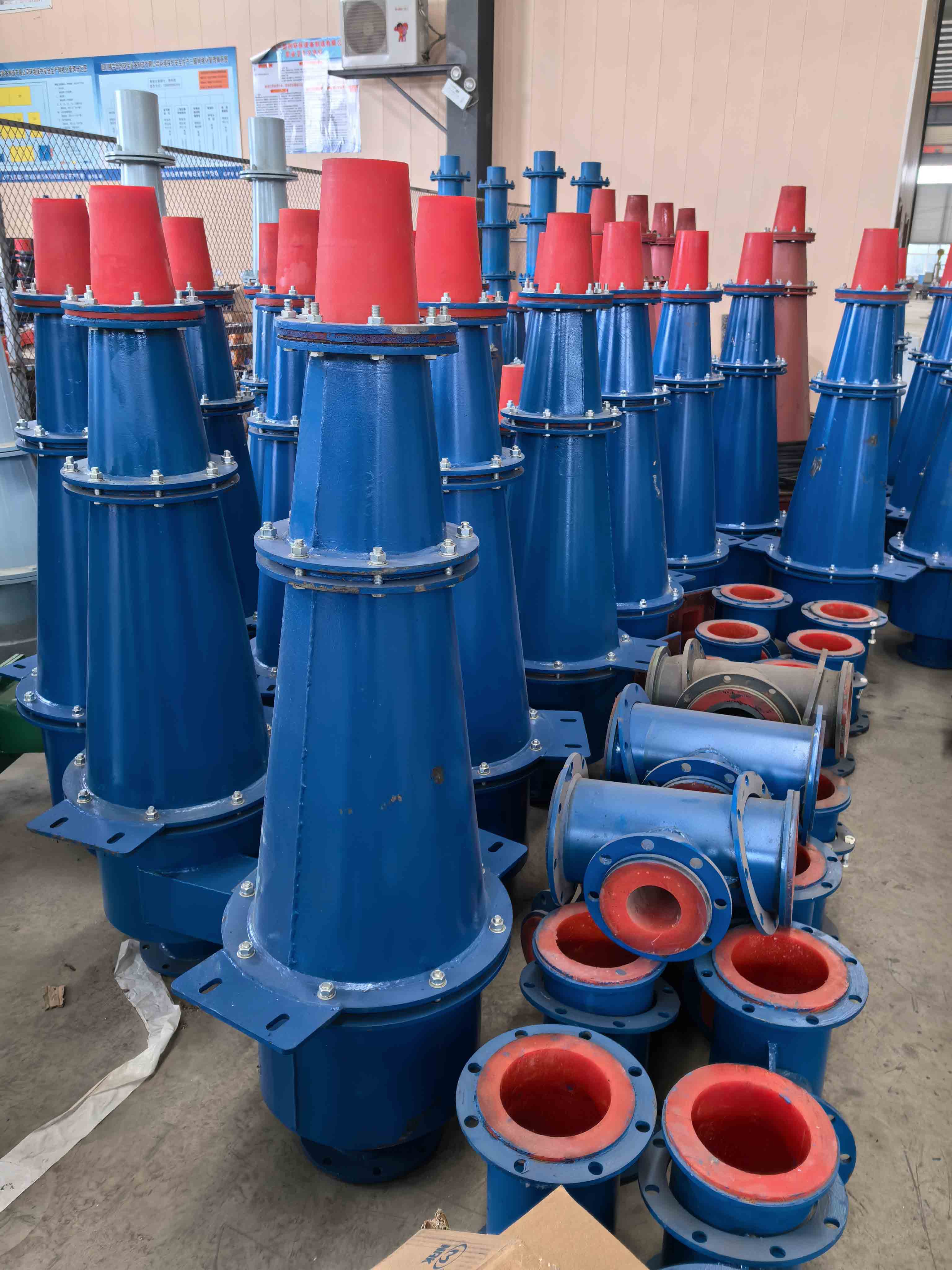 水力流器内衬耐磨层根据不同的物料特性和工作条件可采用刚玉、高耐磨橡胶、复合陶瓷、陶瓷复合材料、聚氨酯等材质。也可根据现场需要,针对旋流器结构中各部件的耐磨性要求,在一台旋流器的不同部位采用不同材质的耐磨衬层,以增加旋流器的整体使用寿命。同时更长时间的保持旋流器内部流道的形状和尺寸,从而保持稳定的分级效率和分级精度。