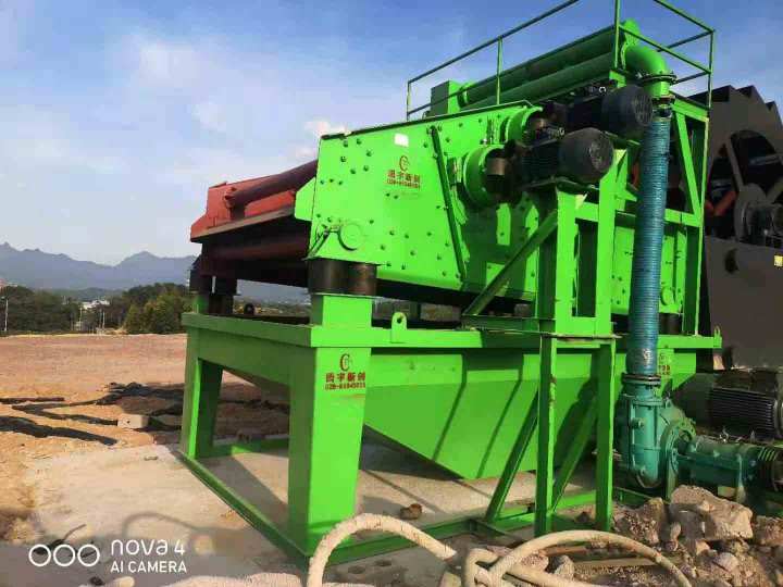 3、由轮斗洗砂出料口进入脱水回收设备上高频直线振动脱水筛做进一步的脱水除泥除介质处理,从而降低成品砂的含泥量及含水率;与此同时从螺旋洗砂和轮斗洗砂溢流口流出的废水含大量细砂,通过溢流管道进入脱水回收一体设备水箱,经渣浆泵输送到..水力旋流器中,然后离心分级浓缩后的细沙,经旋流器沉砂嘴排入轮斗洗砂设备的挖斗里面和粗中细砂混合到一起进行脱水处理,这样可以充分..成品砂粗细搭配均匀合理,同时可以完全回收的细砂成它问题,成品砂的品质更高,颗粒级配更加均匀,成品砂更加干净;