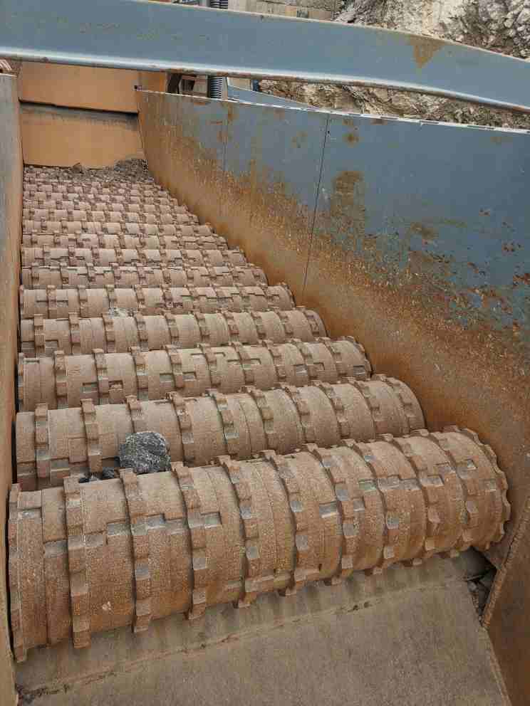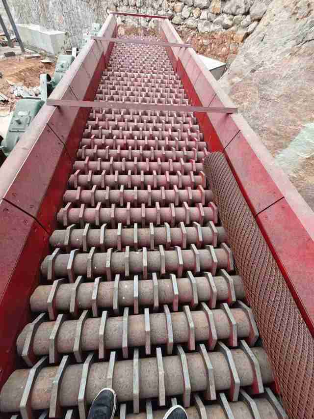 由于筛轴是按不同的工作角度布置的,所以当物料在工作角度较高的位置运行时速度较快;当物料在工作角度较低的位置运行时速度较平缓。两种不同速度运行下的物料,在筛面某一位置相汇时开始做轴向运动,这样就使物料均匀地分布在筛面上,达到了提高筛分效率的目的。滚轴筛的筛面由很多根平行排列的、其上交错地装有筛盘的轴组成,滚轴通过链轮或齿轮传动而旋转,其转动方向与物料流动方向相同。为了使筛上的物料层松动以便于透筛,筛盘形状有偏心的和异形的。为防止物料卡住筛轴,装有..保险装置。滚轴筛全部为座式,有左传动和右传动之分。物料从入料口进入筛箱后,由于前5根筛轴和水平成15°大夹角,物料开始在自重和筛片转动的双重作用下 以较快速度向下移动同时进行筛分,此为初步粗筛分阶段。大部分物料经此阶段后被筛分完毕并平铺在整个面上;当物料进入后5根筛轴以后,由于筛轴排列近乎水平,筛轴和水平成5°,物料前进速度减慢,此为筛分的精筛阶段,物料经此阶段后小于30mm的粒度已被筛下,大于30mm的物料经出料口被送入碎碎机进行下一步破碎。